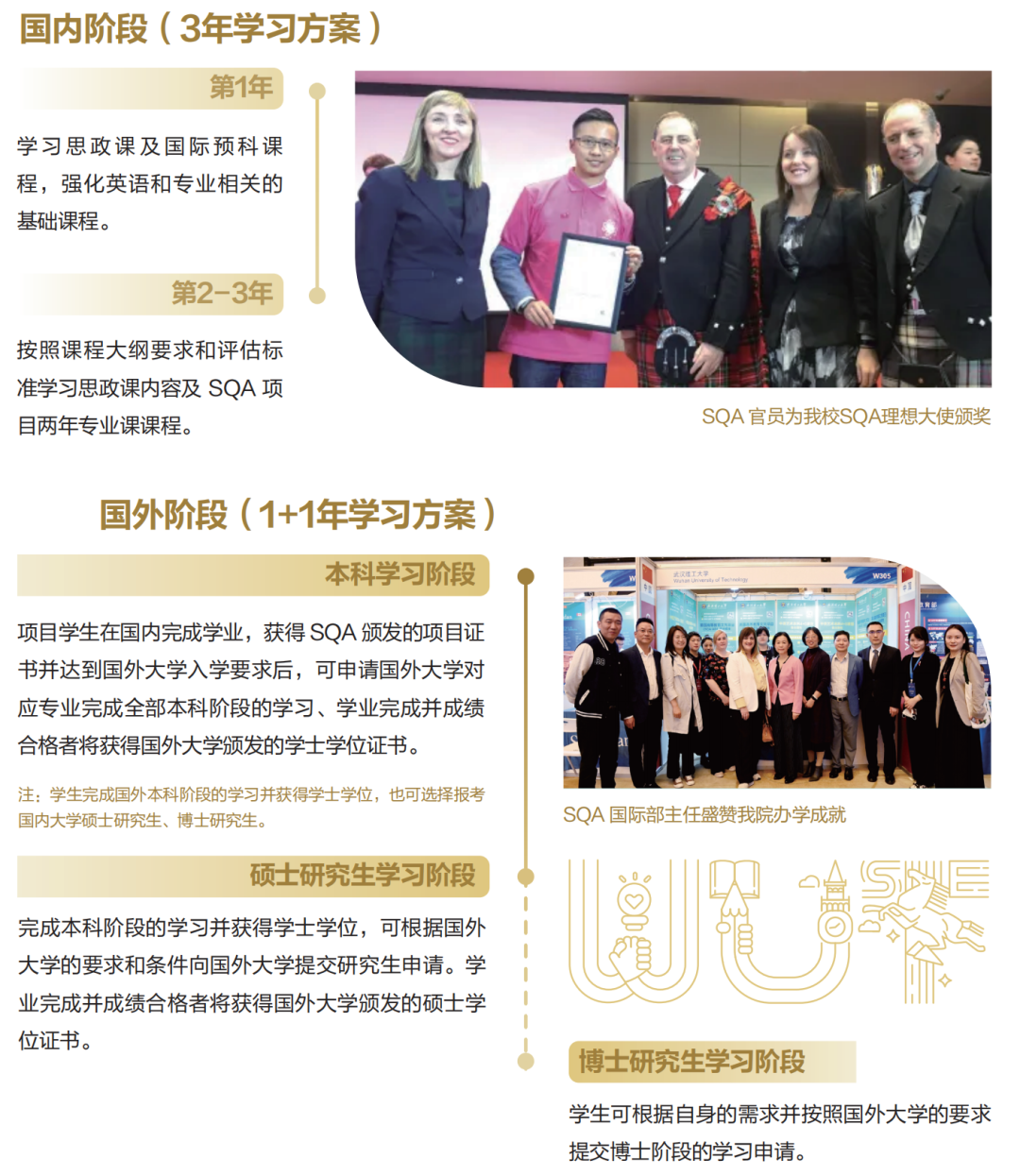 SQA AD项目学生在我校修完相关课程获得英国高等教育文凭证书后,自费前往项目合作院校留学1年,成绩合格即可获得该大学学士学位,之后还可继续申请攻读硕士学位。中国(教育部)留学服务中心给予学历学位认证。