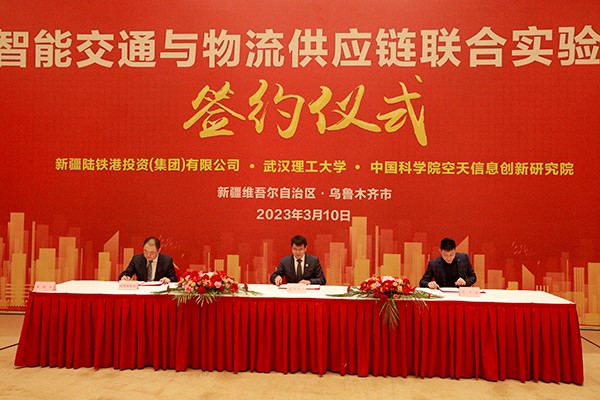 3月10日,智能交通与物流供应链联合实验室(以下简称“联合实验室”)签约揭牌仪式在新疆乌鲁木齐市举行。副校长吴超仲、新疆维吾尔自治区政协副秘书长叶美金,乌鲁木齐市委副书记、市政协党组书记张钰祥、乌鲁木齐甘泉堡经济技术开发区(工业区)管理委员会主任程新建、中科院空天信息创新研究院-国家遥感应用工程技术研究中心(简称“空天院”)副主任孙麇、新疆陆铁港投资(集团)有限公司(简称“陆铁港集团”)董事长叶浩出席签约揭牌仪式。