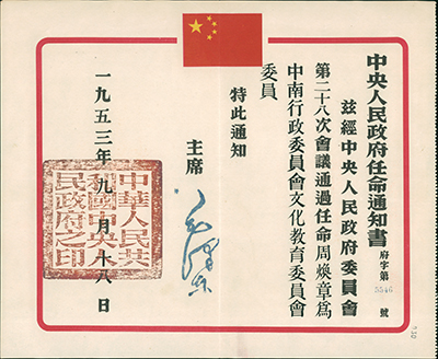 1954年中央人民政府政务院任命周焕章为武汉市文化教育委员会委员
