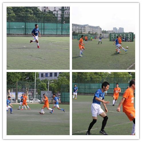 我校教职工足球队作为全省18支代表队之一,应邀参加本次比赛。在揭幕战中对阵中国地质大学教职工足球队。中国地质大学教职工足球队作为传统强队,在上一届高校教职工联赛中取得不俗成绩。随着裁判一声哨响,比赛正式开始。一开场地大教工队就展现出咄咄逼人的气势,多次对我方球门发动进攻。面对劲敌施压,我方队员并没有畏首畏尾,而是展开全面防守,地大的强烈攻势在我方的防守之下也无能为力,守门员余文瞾老师更是表现神勇,高扑抵挡,多次化险为夷。稍后,我方队员调整状态,逐渐掌握场上节奏,并开始猛烈反攻。第21分钟,牟军敏老师前场断球后下底挑过守门员传中,对方在解围过程中不慎手球,点球!中场大将汤军老师一蹴而就,操刀命中!1:0!我方取得领先!取得领先后,我方球员士气大振。上半场结束前,中场核心许絮老师连续突破两名对方防守人员,在禁区右侧突施冷箭,小角度劲射破门!2:0!我方再次取得进球。面对我方的再次领先,地大教工情绪发生明显变化,开展更疯狂的反扑,多次在我方门前制造威胁,但都被我方的防守球员一一化解。双方以2:0的比分结束上半场。