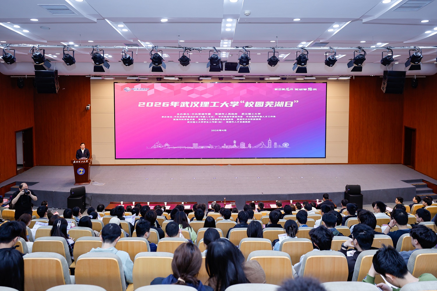 新闻网讯 紫云英花开、芜湖等您来,4月24日,2026年“校园芜湖日”活动在校举行。芜湖市委书记宁波、副市长朱子,校党委书记孟芳兵、校党委副书记刘春江等出席人才招聘宣讲会、产学研合作恳谈会等相关活动。