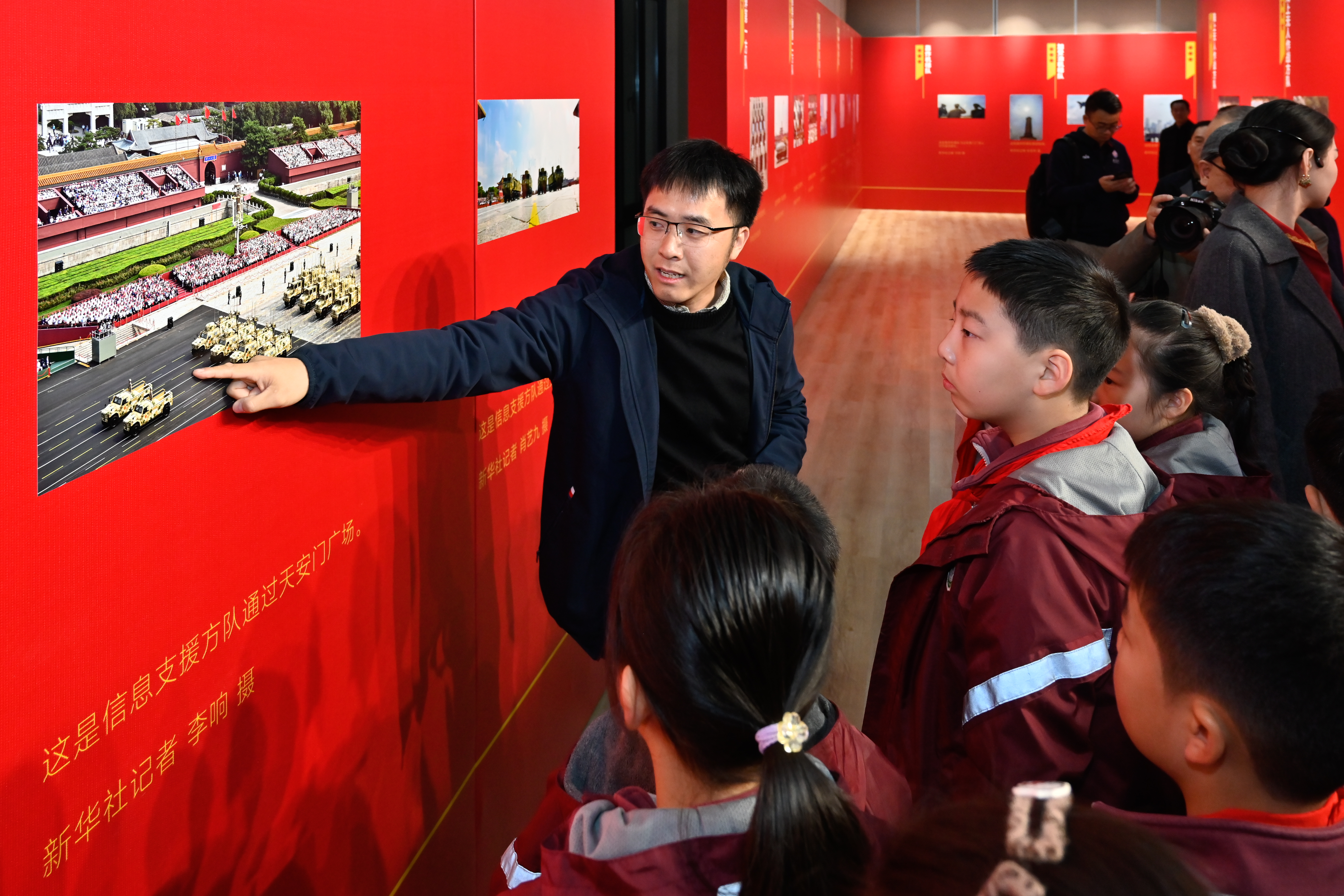 2025.12.10“影像里的大思政·九三阅兵展”湖北高校首展在校开幕,新华社记者向小朋友讲述经典影像作品创作故事