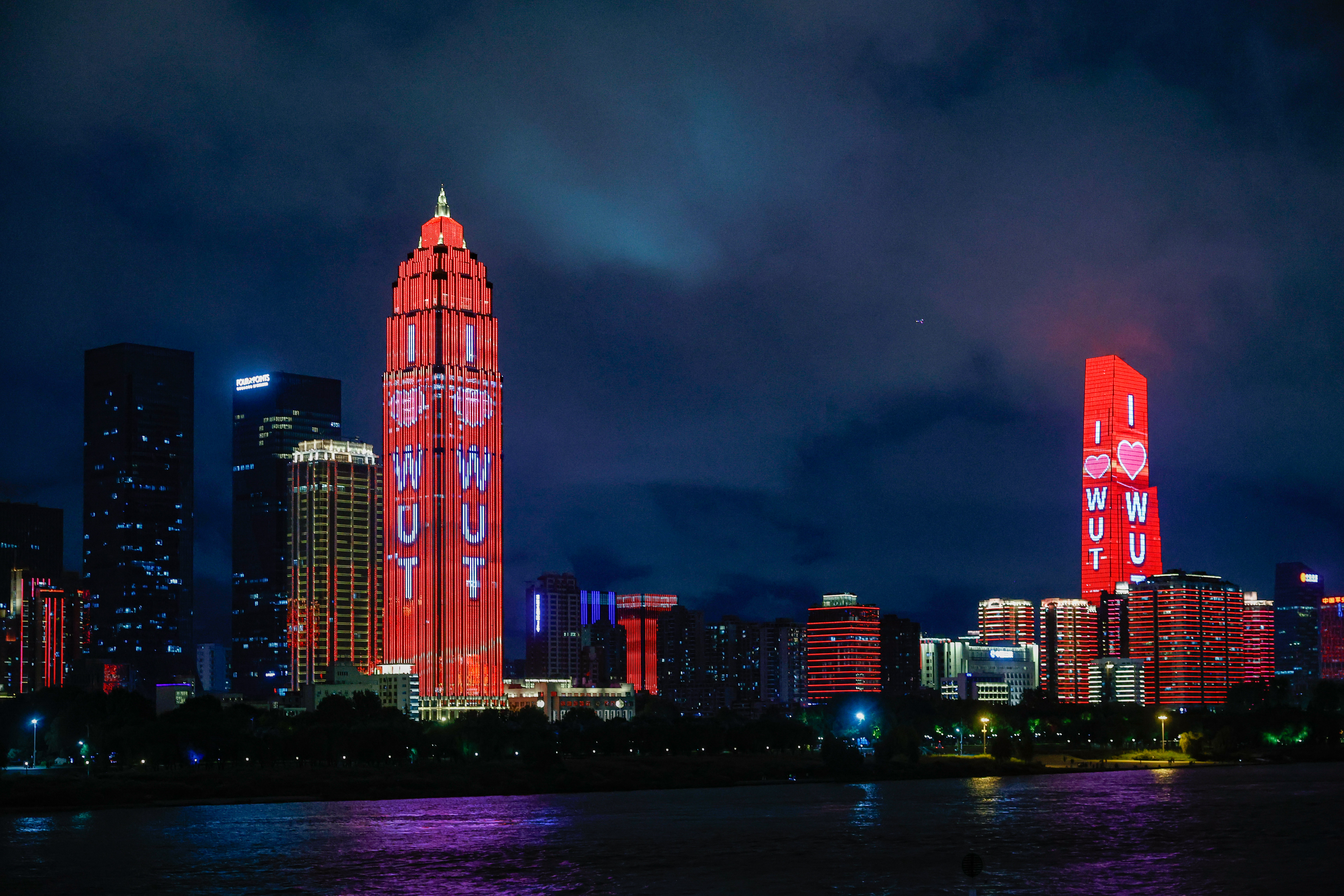 2025.10.17晚,武汉理工大学·中国车谷产业生态合作交流会期间,武汉“两江四岸”专属于武汉理工大学的灯光秀在夜空中璀璨绽放