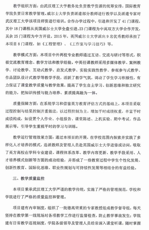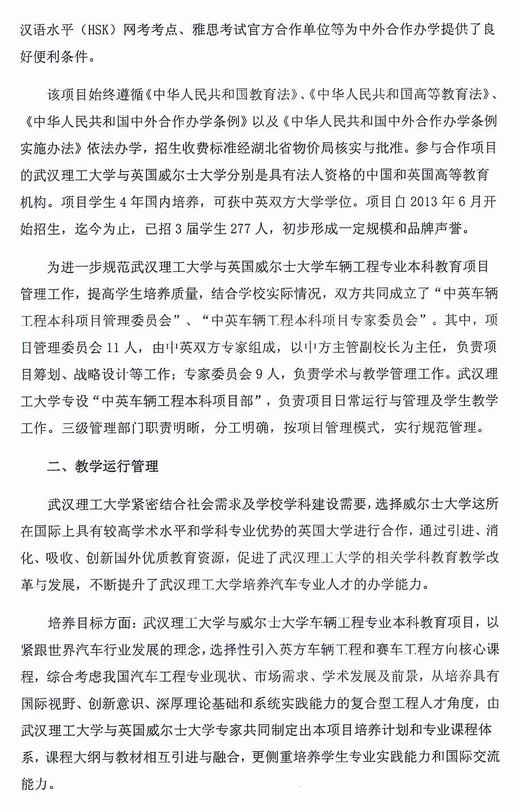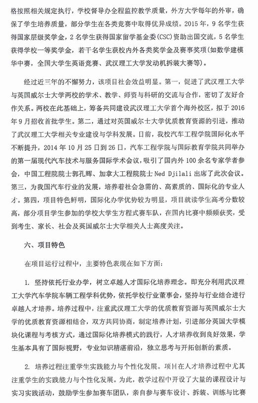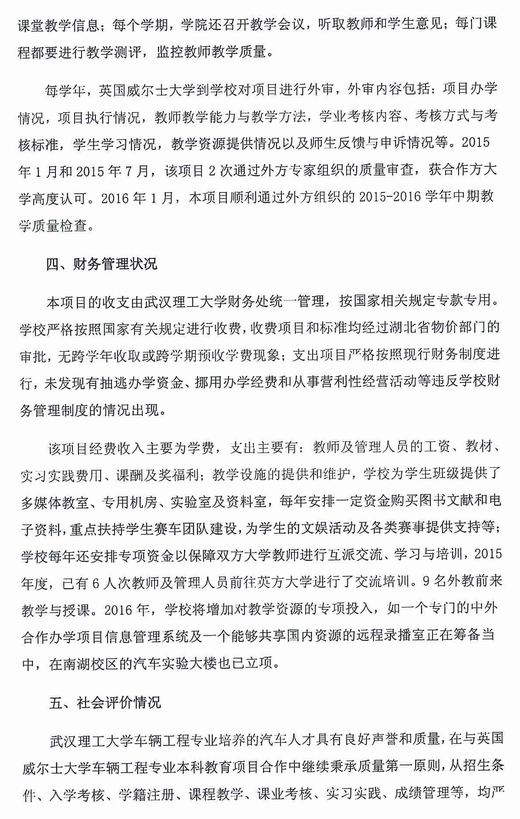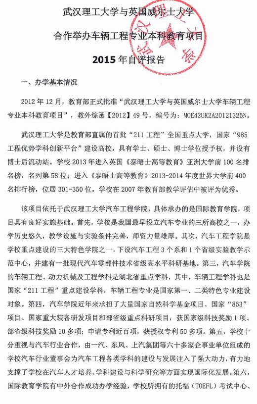 武汉理工大学与英国威尔士大学合作举办车辆工程专业本科教育项目2015年度自评报告