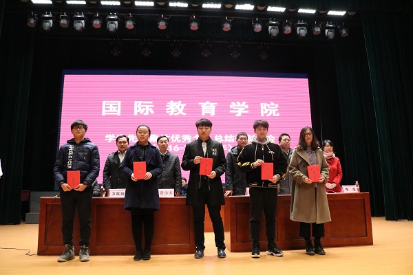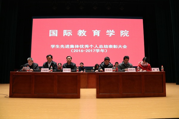 与会领导依次为校标兵班集体、校优秀班集体、校三好学生标兵、校三好学生和学术、科研、竞赛优秀奖获奖代表颁发荣誉证书并合影留念。伴随着悠扬的《卓越之歌》,国际教育学院2016-2017学年表彰大会圆满落幕。