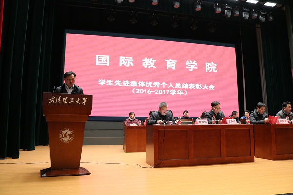 会议在庄严的国歌声中拉开了帷幕。紧接着,党委副书记方胜新上台作2016-2017学年国际教育学院学生工作汇报。方胜新副书记在汇报中指出,教育工作者首先要做到以身作则、率先垂范,恪守兢兢业业、甘于奉献、奋发有为的工作态度。同时在深入领会党的十九大精神的基础上,思考如何与学生工作的实际相结合,为学生的发展启航、领航、导航、护航。据方书记介绍,在校党委的正确领导下,过去一年里,我院坚持以立德树人为中心,开展了形式多样、模式创新、效果良好的思想政治教育工作。在2016-2017学年里,我院学生工作取得了可喜的成绩。方书记以详实的数据和案例,从党委抓课堂、学工口学生管理、毕业生升学率与就业率等方面展开阐述,梳理了这一年来学生工作的典型做法和积极举措。