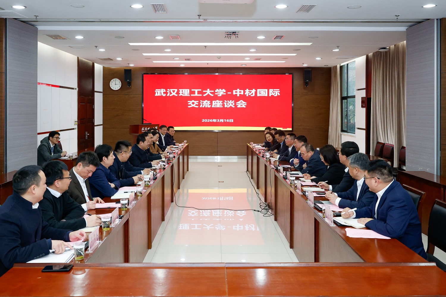 新闻网讯 3月16日,中材国际党委书记、董事长印志松,党委副书记、工会主席蔡军恒一行来校交流座谈会在会议中心104召开。校党委书记孟芳兵、副校长胡剑出席会议。